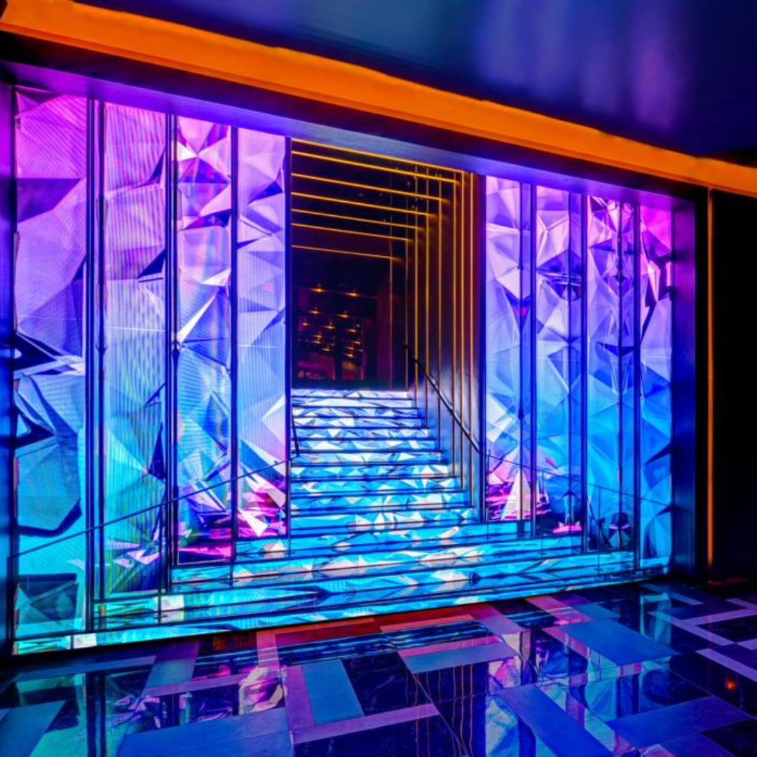 - Architectural LED Wraps: LED ribbons contour the venue’s structural elements, pulsing in perfect time with the beat