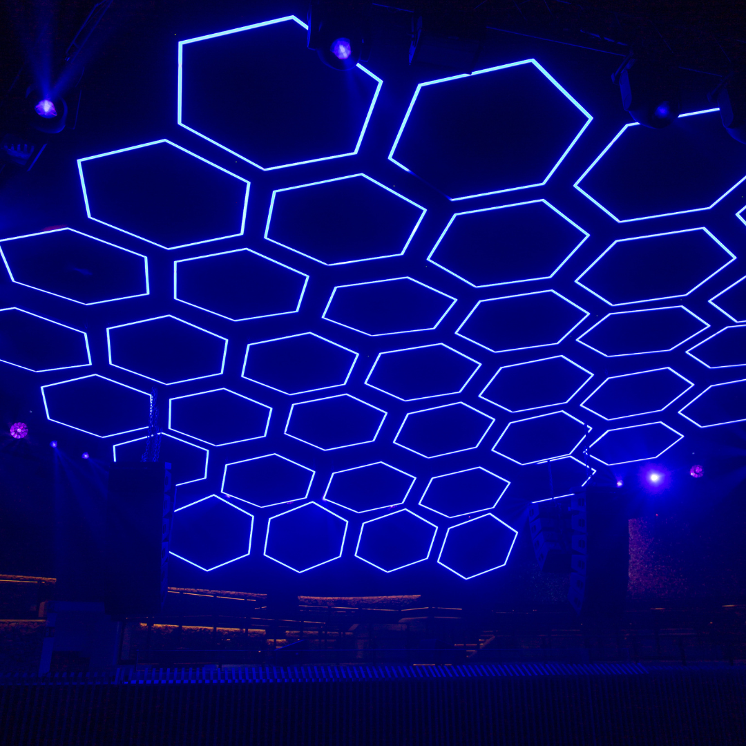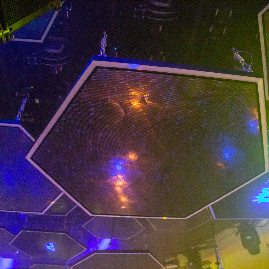- 37 Custom Hexagonal LED Panels: Each 1.8m wide, forming a massive modular display. Supplied by TaylorLEDS, the panels are built into aluminium frames wrapped with high-power LED strips.