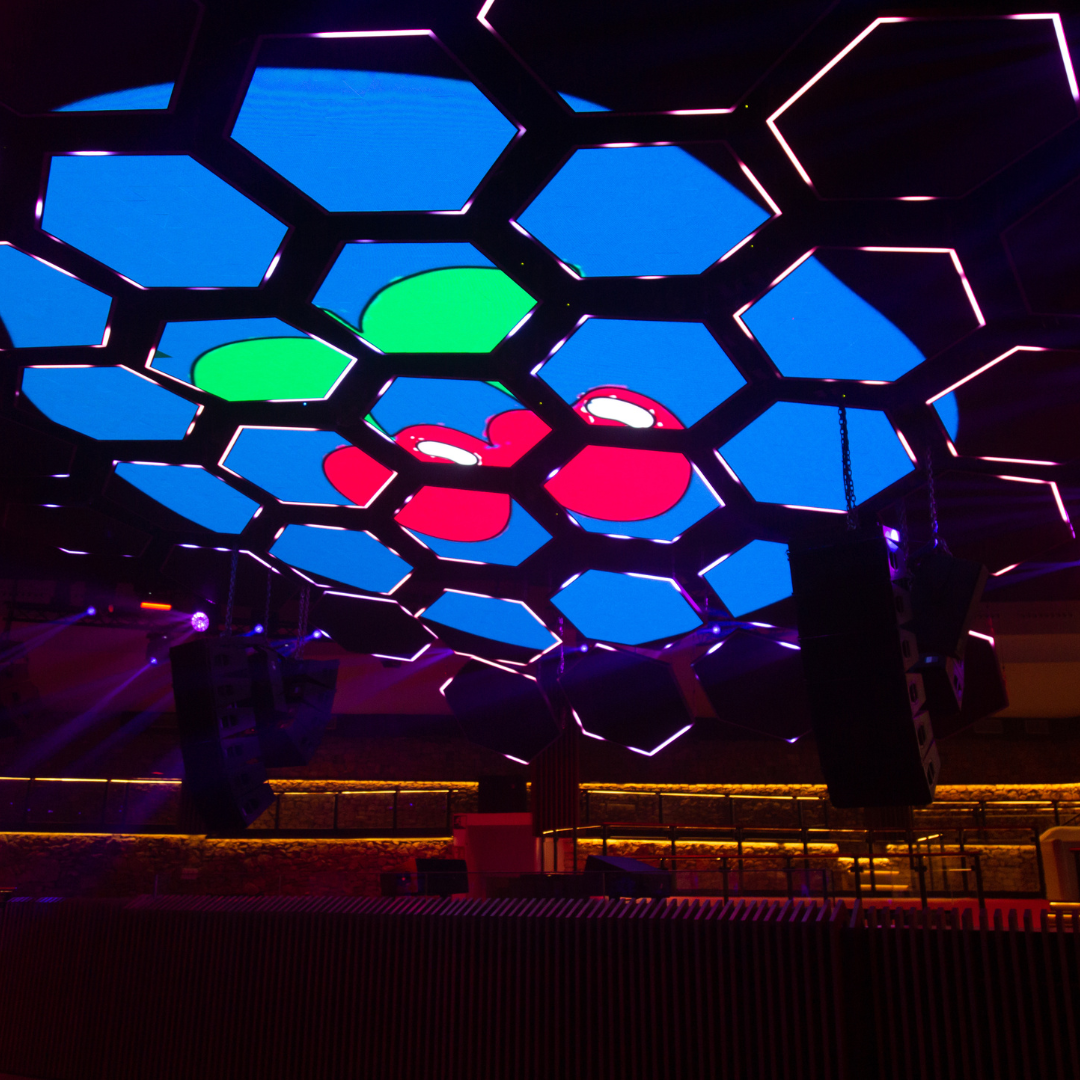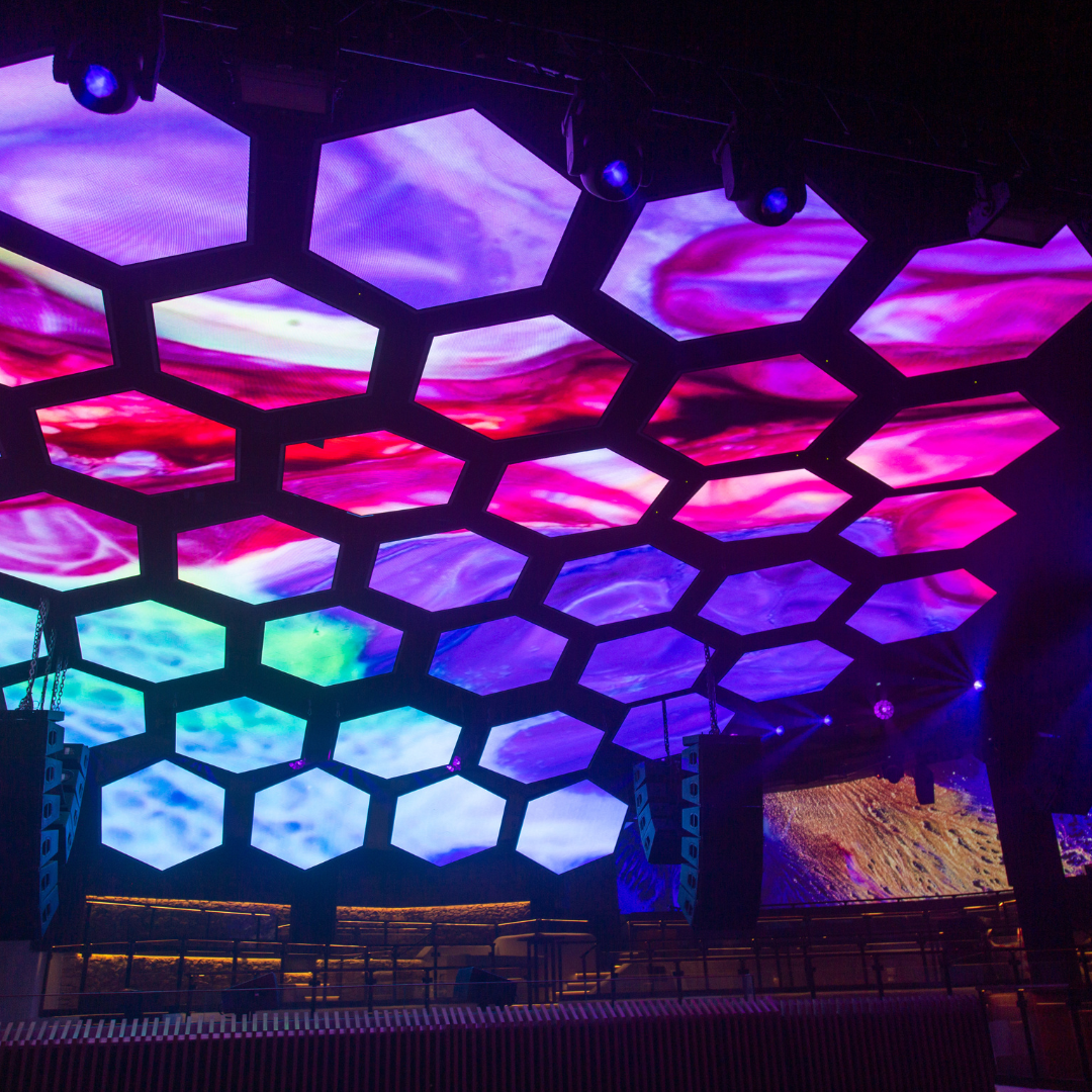 Collaborating closely with Pacha’s in-house team, Audiotek proposed a custom-built hexagon-based rig as the centrepiece.